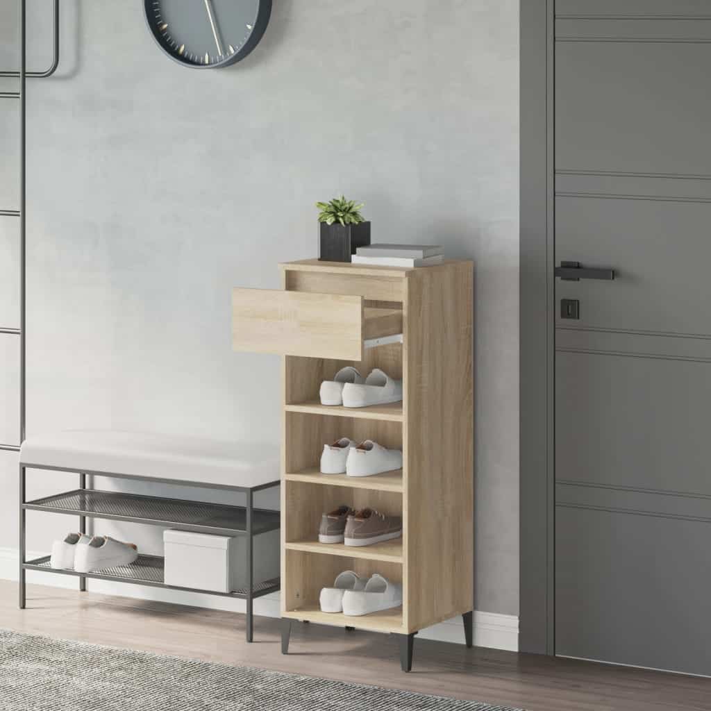 Keep your shoes away from cluttering to create a tidy environment with this elegant shoe rack! Durable material: The engineered wood is of exceptional quality with smooth surface and also features strength, stability and resistance to moisture. Stable frame: The metal feet of this shoe cabinet add an industrial and calm style to your interior while ensuring stability. Ample storage space: This shoe storage features a drawer and 3 shelves, providing ample space to keep your shoes within reach and well organised. Sturdy top: The sturdy top of the shoe storage cabinet is ideal for displaying decorative objects, photo frames, or potted plants. Warning:In order to prevent overturning, this product must be used with the wall attachment device provided. Note:Each product comes with an assembly manual in the box for easy assembly. 105 40 36 Black, Brown Oak, Concrete Grey, Gloss White, Grey Sonoma, Oak, Smoked Oak, White 561834 Delivery Sometimes if the delivery driver does not feel there is a safe location to leave the parcel unattended, they may leave a collection card and return it to the local depot, please be advised this is at the discretion of the driver. In this case, please contact the courier directly to make re-delivery or collection arrangements. Multiple shipments Delivery Time Estimates Enter your postcode in the shipping calculator provided or at the cart page to see estimated delivery timeframes. These are a date range based on the current information the carriers have available for delivery to your area. We find in the majority of the cases your product will be delivered on, or even before, these timeframes. 14 Day Return Policy We at Complete Storage Solutions would like for you to be happy with your purchase with us. If you do change your mind or are not satisfied with the product, we can arrange for a return of your item if you contact us within 14 days of the delivery arrival. You will be responsible for the applicable shipping costs to facilitate the return, including the original shipping costs of sending the item to you and the cost of returning the item back to the warehouse. The item will be need to be returned in its new condition and securely packaged in the original packaging of the item. We may request a photo of the item in its packaging prior to arranging the return booking. We will offer the choice of:- To ensure appropriate tracking of the returned goods, all returns are to be arranged through Complete Storage Solutions. We accept no responsibility for items that are returned to us outside of being organised by us. We reserve the right to refuse returned items if the items do not comply with our returns policy. Any items we have refused will be posted back to you and additional postage will be charged to you. Faulty, Damaged, Missing Parts or Incorrect Item Received All customers need to check all of their packages ideally within 7 days of delivery arrival to ensure the product has arrived in satisfactory condition, undamaged and with all its parts. If there is any issues with the delivery we must be made aware within 14 days of delivery arrival at the latest by contacting us and reporting the problem via our contact us page. There is also an option to choose “Report a problem” here, please provide as much detail as possible and include photos or a short video of the issues to assist in a quick resolution. As some file types may not upload there, you can also email us with all the needed information at [email protected] More information is available on our Terms & Conditions and Shipping & Returns Pages WARNING: